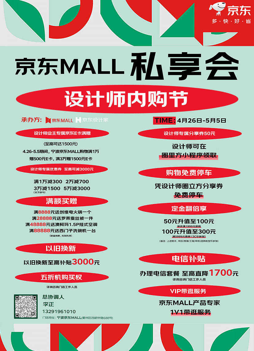 4月29日,2024京东设计家私享会暨京东MALL设计师内购节首站即将盛大落地宁波!2024年全新归来,京东家电家居生活板块焕然一新。作为2024年首站活动,京东MALL设计师内购节将并蒂齐发,打响京东全年4大内购节第一枪,让消费者跟着设计师买买买,省心又省钱;作为内购节面向设计师的重要模块,京东设计家还将邀请设计精英们,一同相聚宁波京东MALL畅谈设计趋势。